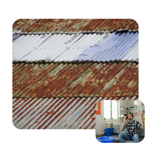 Old roof, rusted sheets, cracked tiles, loose ridge capping